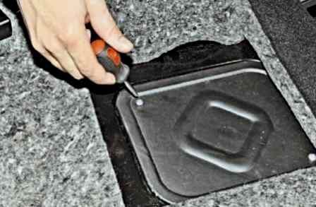 В любом случае лучше сбросить давление, для чего устанавливаем правую подушку заднего сиденья в вертикальное положение. Крестообразной отверткой отворачиваем два самореза крепления крышки лючка и снимаем крышку.
