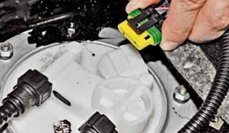 Отжав фиксатор колодки, отсоединяем колодку проводов от топливного модуля. В результате топливный насос будет обесточен и не сможет создавать дополнительного давления в системе.