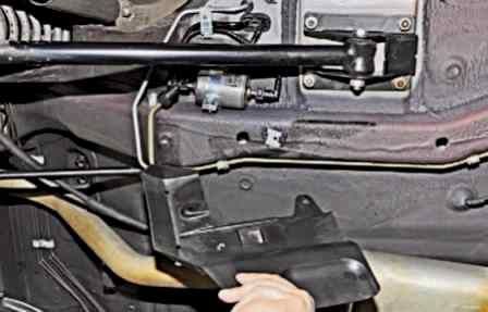 Теперь отправляемся под днище. Головкой «на 10» отворачиваем болт и две гайки крепления кожуха. Снимаем кожух топливного фильтра Шевроле Нива.