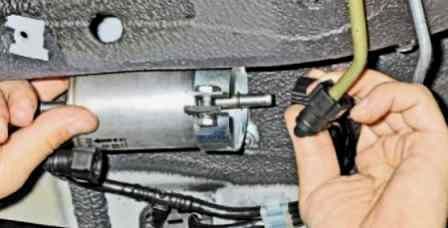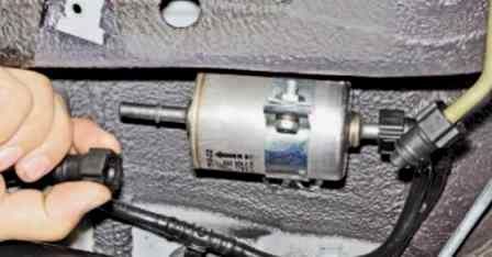 Сожмите фиксаторы наконечника трубки, при этом отодвигая фильтр и вытягивая штуцер. Вытаскиваем топливный фильтр. Если внутри имеется топливо, его нужно слить. Инсталлируем новый фильтр.