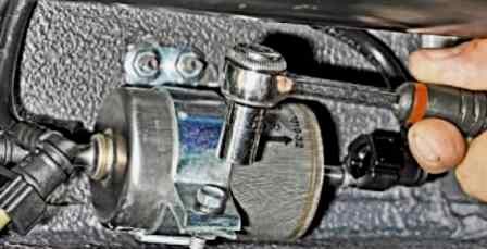 9. Тем же ключом на 10 откручиваем болт хомута крепления фильтра.